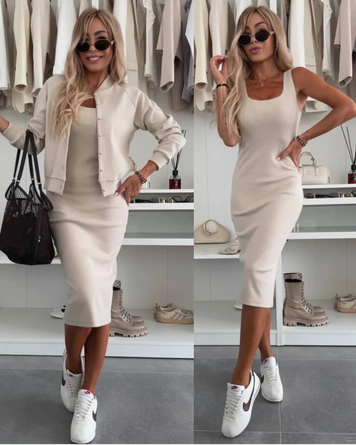 Turn heads with this ready-to-wear 2-piece outfit that blends casual cool with feminine charm. The ribbed midi dress hugs your figure in all the right places, while the soft, structured jacket adds a touch of polish and versatility. Whether you’re heading to brunch or stepping out for the evening, this set keeps you stylish with zero effort.