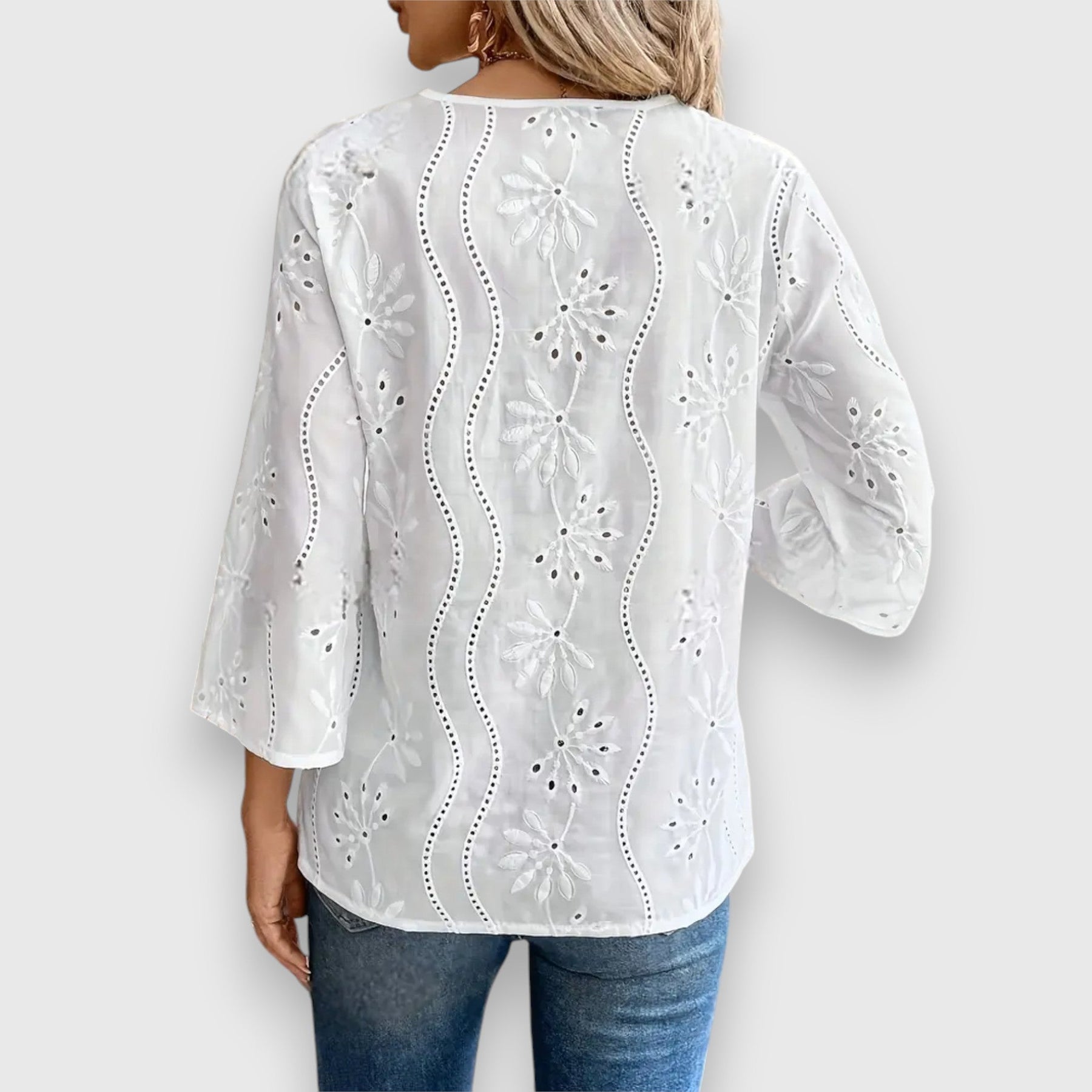 The Tessa blouse impresses with its stylish eyelet pattern and feminine 3/4-length sleeves, perfect for spring and autumn. Its classic, single-colour design makes it a versatile companion for a wide range of occasions – whether casually combined or elegantly styled.